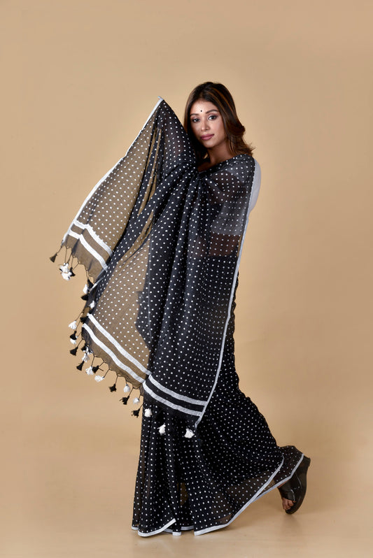 Black & White (All Over Dots) - Hand Block Printed Cotton Saree