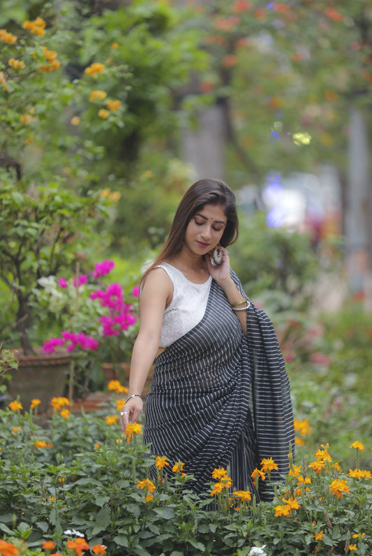 Black & White Cotton Lines Saree