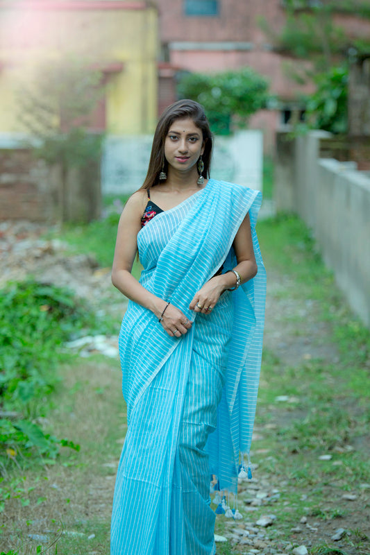 AZURE BLUE AND BLACK - HANDWOVEN COTTON SAREE