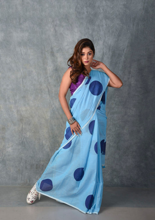 Sky and Navy Blue Polka - Hand Block Printed Cotton Saree