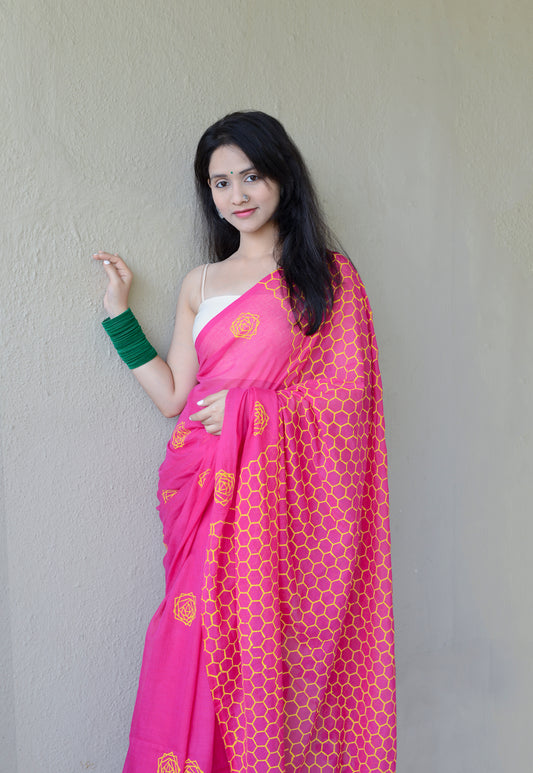 Rani Pink & Yellow Polka Dots - Hand Block Printed Cotton Saree