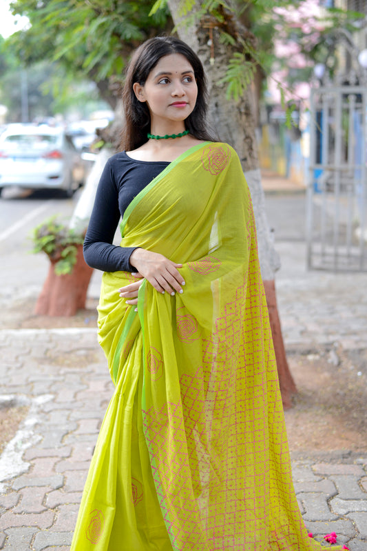 NEON GREEN - LOVE HAND BLOCK PRINTED COTTON SAREE